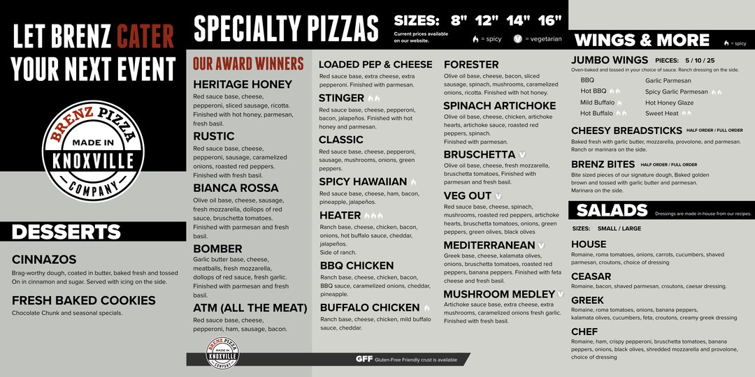Located in the heart of Knoxville, Brenz Pizza Co. brings bold flavor and fresh ingredients to the table. From our nationally recognized specialty pizzas to our crisp salads, savory wings, and indulgent desserts, there’s something for everyone. Choose dine-in, carryout, delivery, or catering—Brenz Knoxville is where quality meets crave-worthy taste.